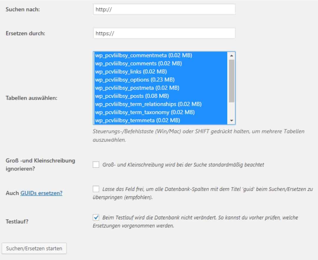 Klicke nun ganz unten auf “Suchen/Ersetzen starten” - Wenn der Testlauf einige Tabellen gefunden hat, kannst du den Haken bei “Testlauf?” entfernen und den echten Lauf starten.