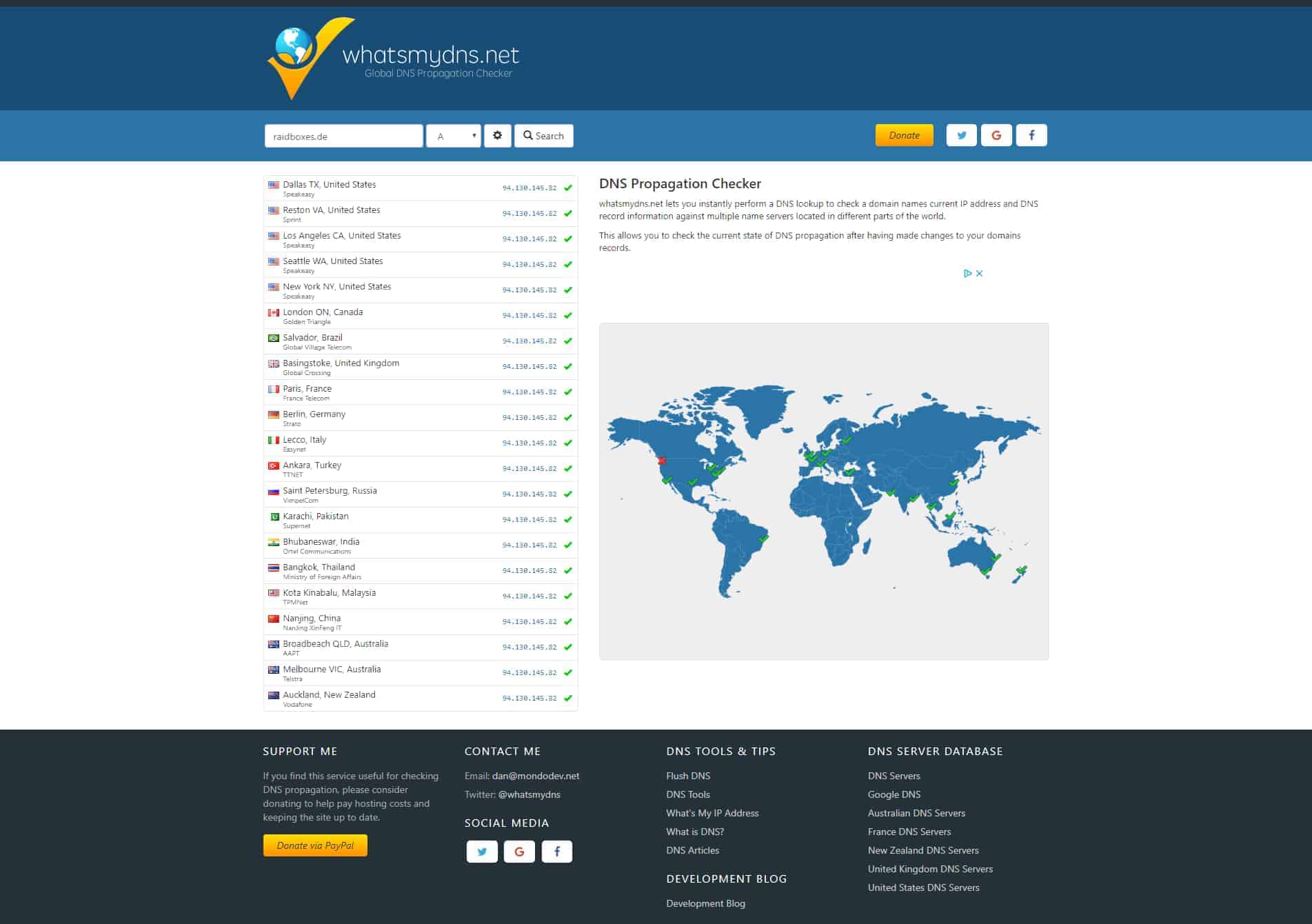 Wenn der DNS-Record bei allen Servern aktuell ist, solltest du überall einen grünen Haken und dieselbe IP sehen. Diese IP sollte in den meisten Fällen auf die IP deines Servers zeigen (Ausnahme: Wenn ein CDN vorgeschaltet ist).