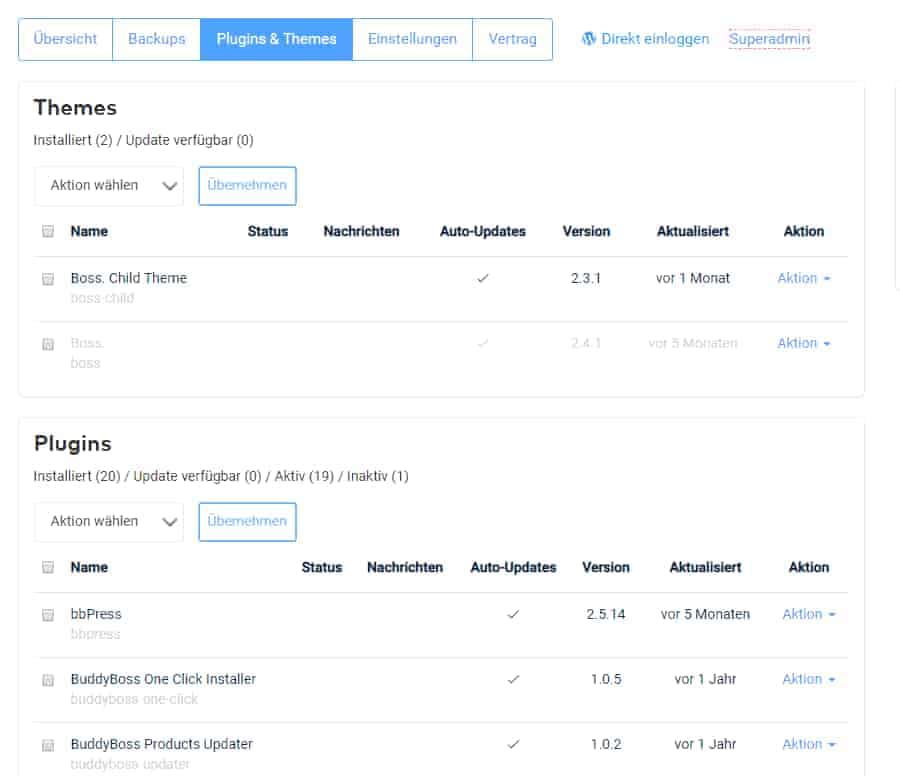 Sollte dir unklar sein, welches Plugin den Fehler verursacht, versuche Folgendes: Benenne nach und nach alle Plugin/Theme-Ordner um. Verschwindet der Fehler nach dem Umbenennen eines Ordners, hast du den Übeltäter identifiziert. Als RAIDBOXES Kunde, kannst du für das Deaktivieren auch einfach die Plugin- und Theme-Verwaltung im RB-Dashboard nutzen.