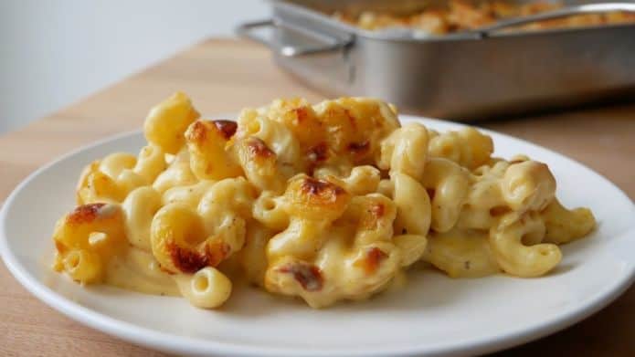 Den fertigen Mac & Cheese Auflauf aus dem Ofen holen & auf Tellern verteilen.