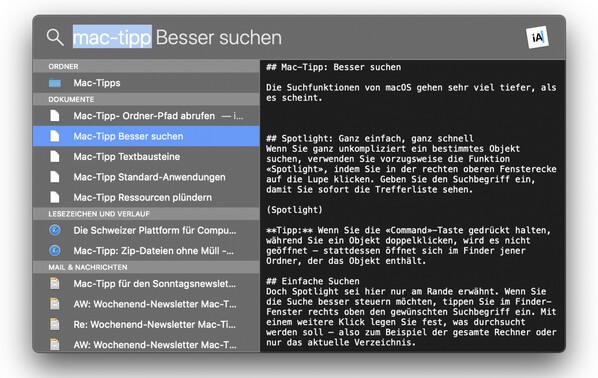 Es ist ein Leichtes, über die Spotlight-Suche ein Dokument aufzuspüren und mit einem Doppelklick zu öffnen. Wenn Sie dazu auch noch die «Command»-Taste gedrückt halten, wird das Dokument nicht geöffnet, sondern in seinem Ordner im Finder angezeigt.