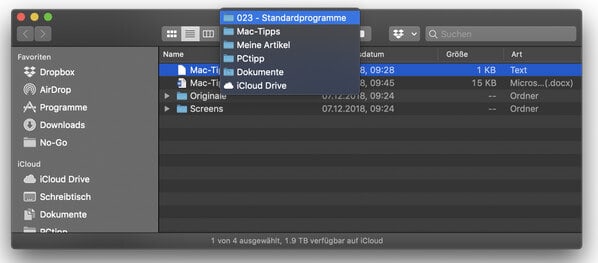 Das klingt praktisch. Doch wo befindet sich das Objekt genau? Die ganze Hierarchie offenbart sich, wenn Sie mit gedrückter «Command»-Taste auf den Fensternamen im Finder klicken. In diesem Menü wechseln Sie auch zu einer höheren Hierarchiestufe: