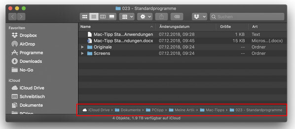 Wenn der aktuelle Pfad für Ihre Arbeit wichtig ist, blenden Sie ihn dauerhaft in jedem Finder-Fenster am unteren Rand ein. Wählen Sie dazu im Menü «Darstellung» den Befehl «Pfadleiste einblenden».