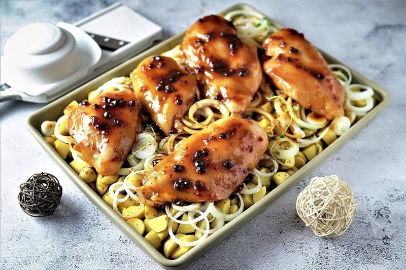Anschließend die marinierten Hähnchenbrustfilets darauf verteilen und mit dem Rest der Marinade bestreichen.