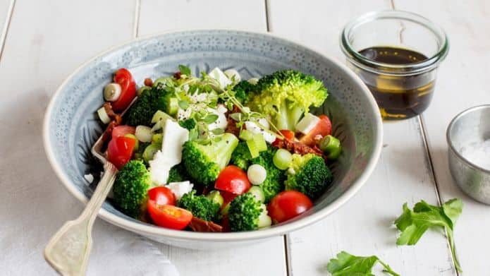 Den Brokkoli putzen, in Röschen teilen und in wenig Salzwasser circa 5 Minuten dünsten. Er sollte noch Biss haben. Die Frühlingszwiebeln in Ringe und die eingelegten Tomaten in kleine Stücke schneiden. Den Knoblauch abziehen und fein hacken. Die Cocktailtomaten waschen und halbieren. Alles zusammen mit dem abgekühltem Brokkoli in eine Schüssel geben.