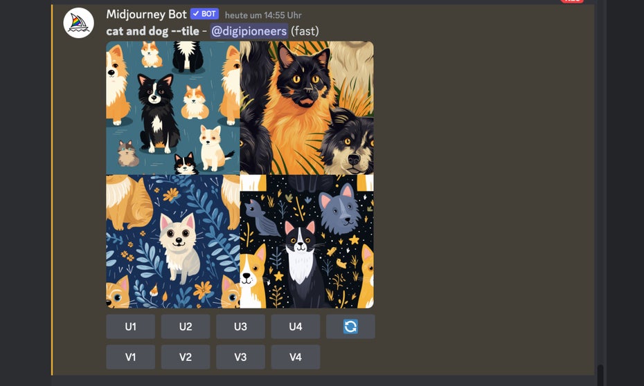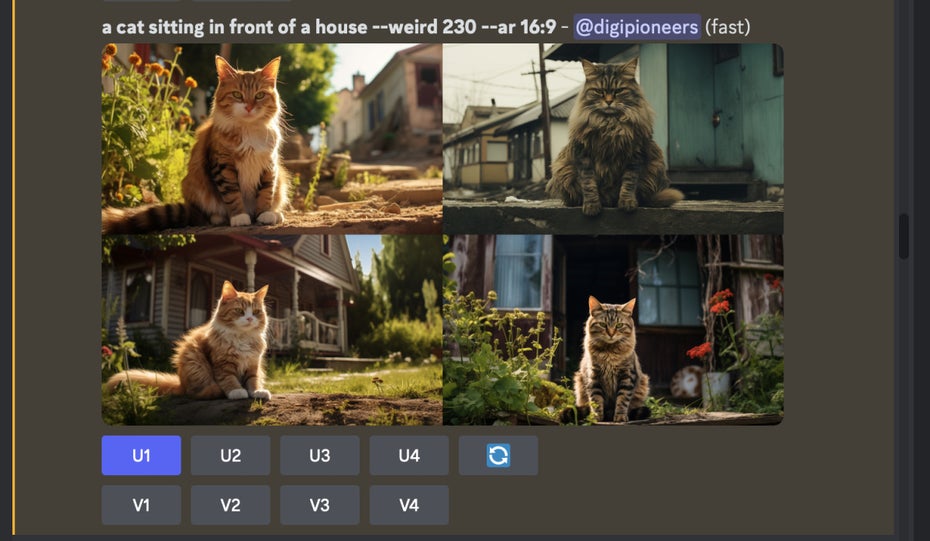 Zu jedem Prompt generiert Midjourney vier Bildvariationen. Um eins davon auszuwählen und als Einzelbild zu erhalten, klickt ihr einfach auf U1, U2, U3 oder U4. Außerdem könnt ihr jeden der vier Vorschläge als Grundlage für weitere Bilder nutzen. Dazu klickt ihr auf einen der V1 bis V4 betitelten Buttons. Die so generierten Varianten orientieren sich bei Stil und Komposition an dem jeweils ausgewählten Bild.