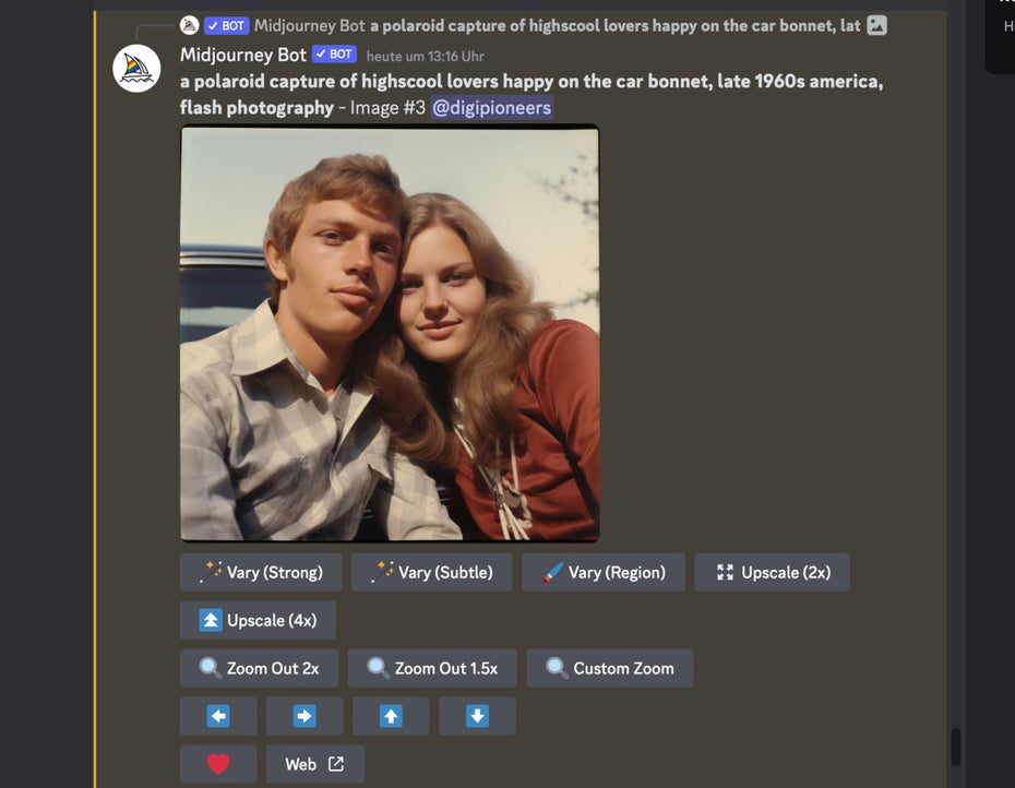 Habt ihr euch über einen der U-Buttons für ein Bild entschieden, gibt euch Midjourney noch eine Reihe weiterer Optionen zur Weiterbearbeitung des Bildes. Mit Vary (Strong) und Vary (Subtle) könnt ihr stark oder subtil veränderte Variationen des Bildes erzeugen.