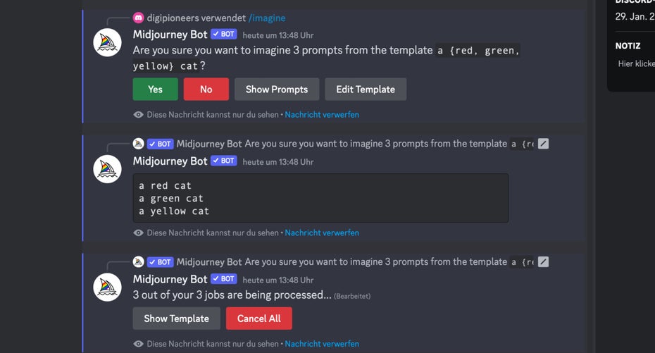 Ein simples Beispiel wäre der Prompt /imagine a {red, green, yellow} cat. Daraus würden dann insgesamt drei Prompt entstehen. Ebenfalls praktisch: Die Funktion könnt ihr auch auf Parameter-Werte anwenden. Ihr könnt also beispielsweise durch den Zusatz --s {0, 300, 500} einen Prompt mit drei verschiedenen Stylize-Werten erzeugen und ausführen.