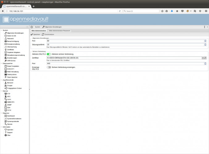 Nach dem Login mit „admin“ könnt ihr OpenMediaVault weiter einstellen. Dieses geschieht jetzt über eine sichere, verschlüsselte Verbindung, die von keinem anderen, der euer Netzwerk mit benutzt, ausgespäht werden kann. Setzt deswegen gleich unter „System > Allgemeine Einstellungen“ das „Web Administrator Passwort“ neu, damit sich keiner unberechtigt mit dem Standardpasswort einloggt.