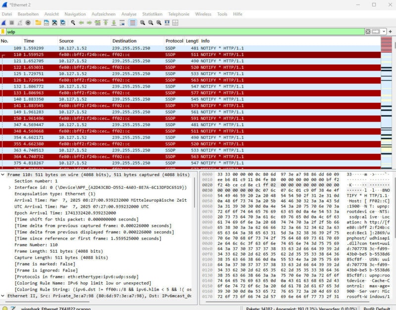 ssdpoderm-searchein und drücken Sie Enter. Dies filtert die Anzeige, sodass nur SSDP- oder M-SEARCH-Pakete angezeigt werden. - Verkehr analysieren: Beobachten Sie die erfassten Pakete. Wireshark zeigt Ihnen die Quell- und Ziel-IP-Adressen, das Protokoll und weitere Details.