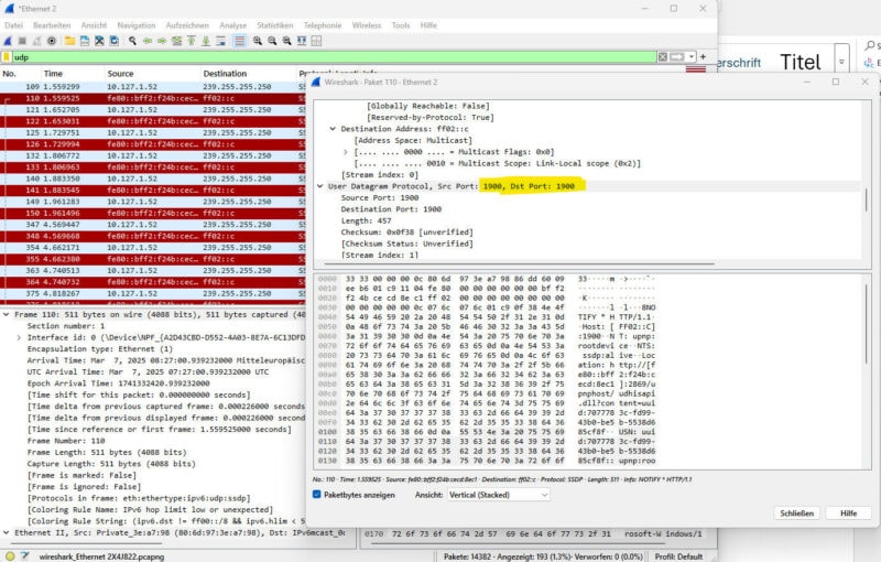 - Filter setzen: Geben Sie im Filterfeld udp and port 1900 ein, um nur UDP-Pakete auf Port 1900 zu sehen, da SSDP typischerweise über diesen Port kommuniziert.