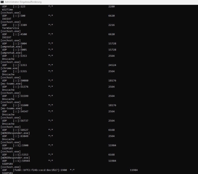 - Nach UDP-Verbindungen suchen: M-SEARCH verwendet UDP. Suchen Sie in TCPView nach UDP-Verbindungen, die auffällig viel Traffic verursachen oder mit unbekannten Prozessen verbunden sind.