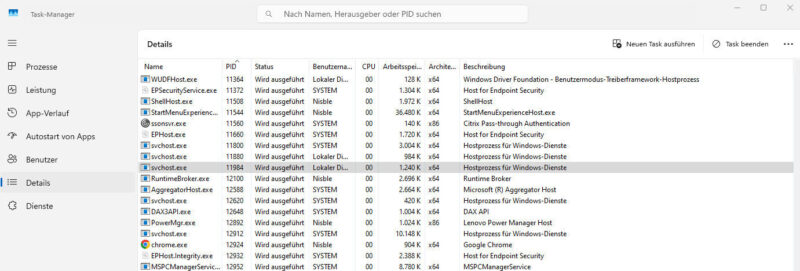 - Programm identifizieren: Suchen Sie im Task-Manager in der Spalte „PID“ nach der zuvor notierten PID. Der zugehörige Programmname wird in der Spalte „Name“ angezeigt.