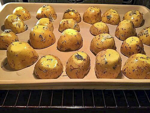Gepressten Knoblauch mit Thymian, Rosmarin, Salz und Pfeffer gut vermischen, darin die Kartoffelhälften kurz marinieren.