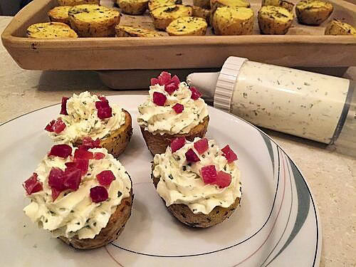 Leicht abkühlen lassen, in der Zwischenzeit die Creme verrühren und anschließend auf den Ofenkartoffeln verteilen.