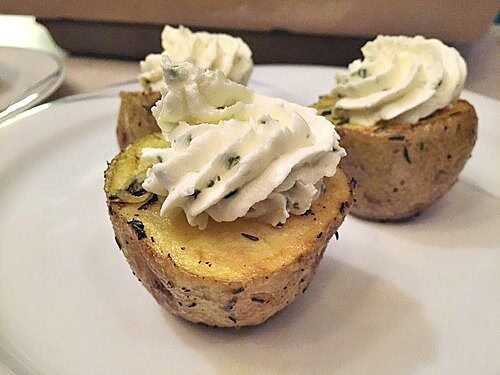 Leicht abkühlen lassen, in der Zwischenzeit die Creme verrühren und anschließend auf den Ofenkartoffeln verteilen.