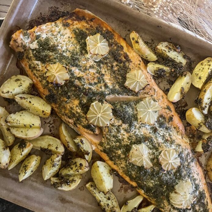- Nach den 15 Minuten den Lachs auf dem Ofengemüse verteilen und mit dem Rosmarin/Thymianöl beträufeln. Feta über das Gemüse bröseln und alles für weitere 15-20 Minuten in den Backofen geben.