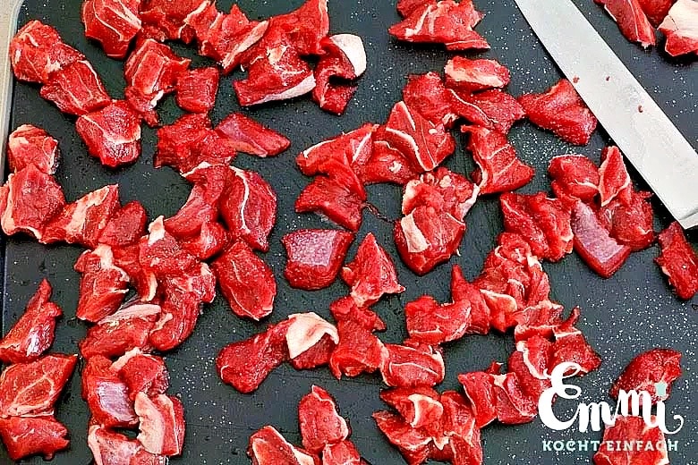 - Im Anschluss die 500 g Rindfleisch in 1,5 cm große Würfel schneiden (sofern das der Metzger nicht schon für Dich erledigt hat) und etwas salzen.