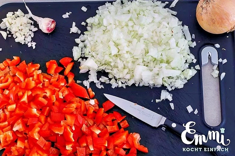- Als Erstes die 300 g Zwiebeln schälen halbieren und in feine Würfel schneiden. 1 Knoblauchzehe fein schneiden und die 2 Paprikaschoten waschen, entkernen und in beliebig große Würfel schneiden.