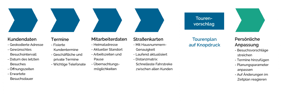 Sie verbringen bisher mehr Zeit im Auto und mit der Besuchsplanung als in Kundengesprächen? Es ist anstrengend, das Puzzlespiel von Kunden mit ihren Prioritäten, Besuchsintervallen und Terminen auf der Landkarte zu einem sinnvollen Tourenplanzusammenzusetzen?