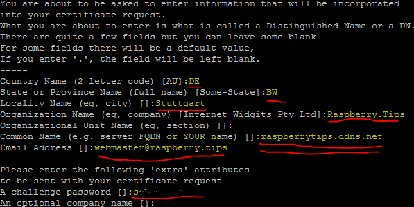 Ihr werdet nach einige Infos gefragt, geht diese an oder überspringt die Eingabe mit Enter. Am wichtigsten ist die Option “Common Name”, gebt hier den Hostnamen (raspberrypi), oder falls ihr DynDns verwendet den kompletten DynDNS Namen eures RasPi ein.