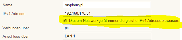 Ich sorge als erstes dafür das mein Raspberry Pi immer die gleiche interne IP-Adresse vom DHCP Server auf dem Router zugewiesen bekommt, die Einstellung findet ihr unter „Heimnetz“ > „Netzwerk“ in den Eigenschaften des raspberrypi. Als Alternative könnt ich auch eine statische IP-Adresse (feste IP-Adresse) für euer WLAN oder LAN direkt in Raspbian einstellen.