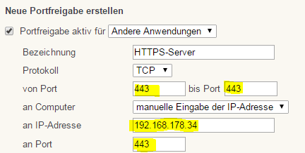 Die Portweiterleitung oder Port Freigabe findet ihr im Fritzbox Menu unter „Internet“ > „Freigaben“ > „Neue Portfreigabe„. Ich erstelle eine Weiterleitung von Port 443 (das ist der HTTPS Port für verschlüsselte Verbindungen) an die feste IP-Adresse das Raspberry Pi an Port 443. Das Protokoll ist natürlich TCP.