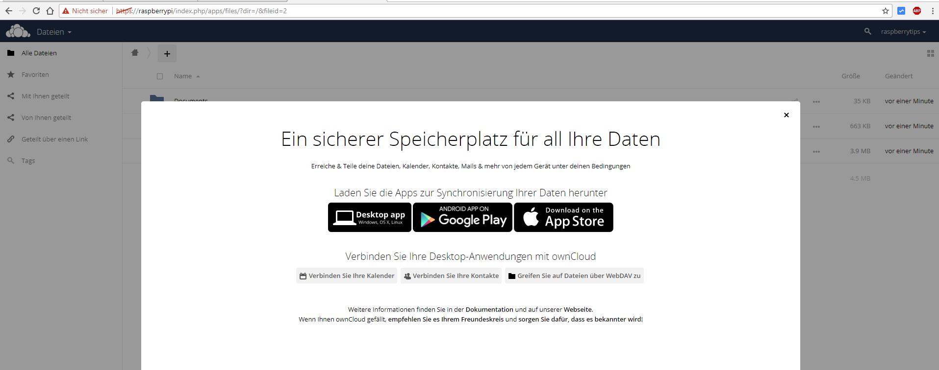 Wenn alles geklappt hat landet ihr nach dem Reboot nun auf eurer eigenen Cloud mit den oben genannten URLs. Für alles weitere solltet ihr einen Blick in die OwnCloud Doku werfen.