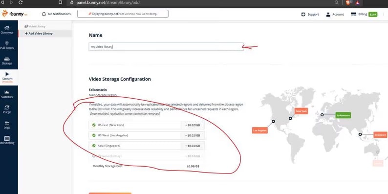 Choose the location where the videos will be replicated, by default is EU Frankfurt for me, and I can replicate the videos in the US (2 data centers) Singapore, and Sydney.