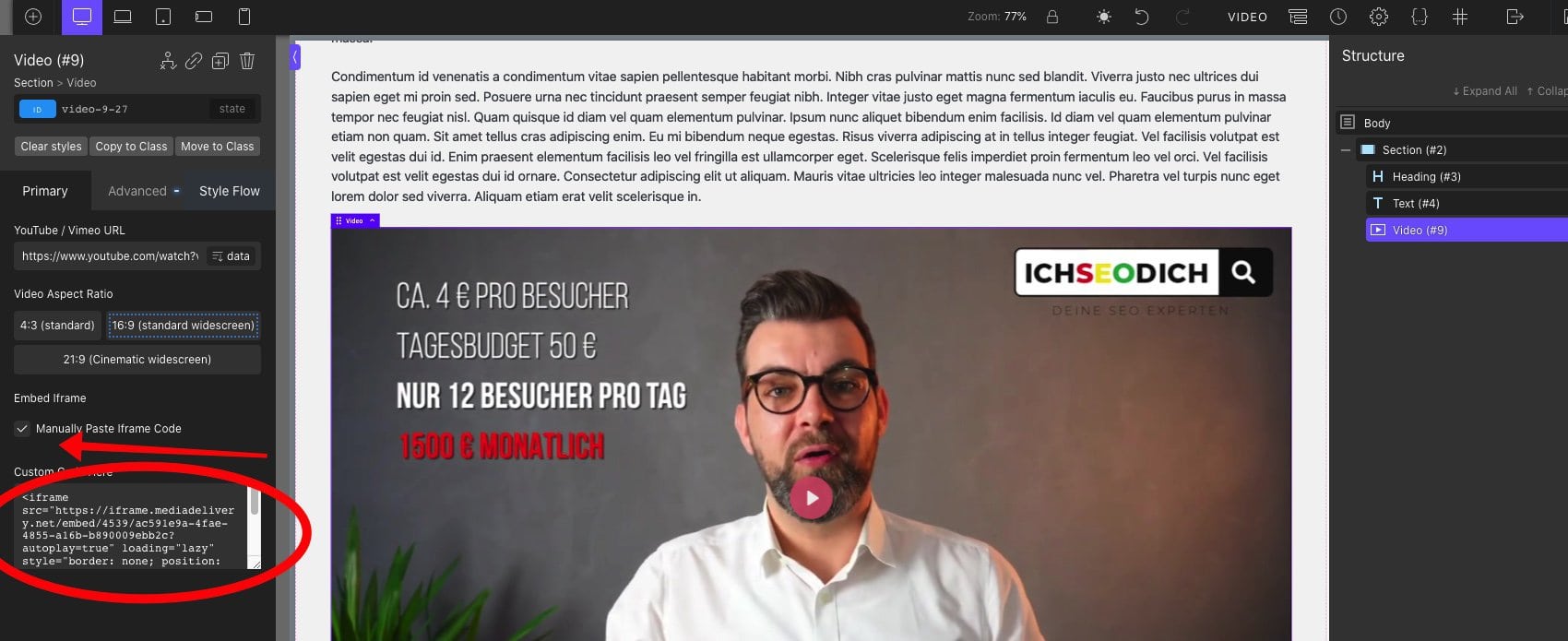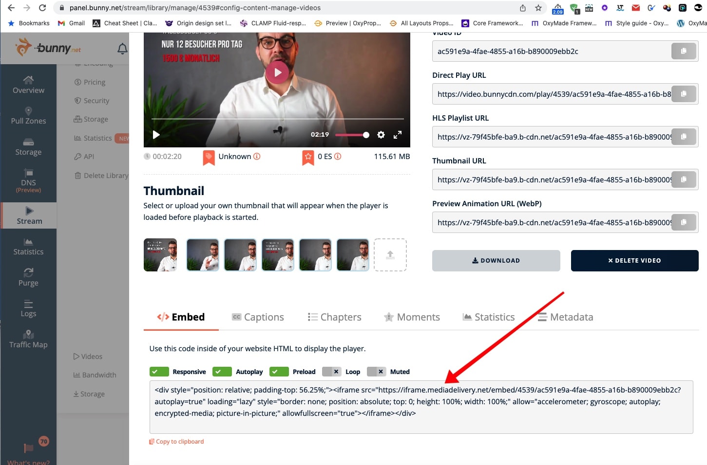Den Embed-Code (ab <iframe src….>) in den normalen Video-Player von Oxygen einfügen. Dazu „Manual Paste iframe Code“ anhaken!!!!!