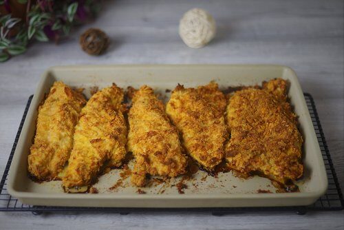 Panierte Schnitzel in die gefettete Form legen und die Panade mit dem Silikonpinsel beidseitig oben sowie seitlich mit etwas flüssigem Butterschmalz betupfen.