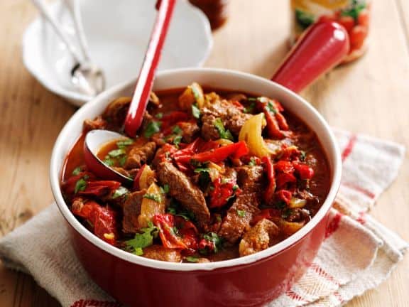 1 EL Öl in die Pfanne geben und Chili, Zwiebel und Knoblauch darin bei mittlerer Hitze glasig dünsten. Tomatenmark und Paprikapulver zugeben und 1 Minute anbraten. Brühe angießen, Fleisch, Paprika und Tomaten zugeben und mit Salz, Pfeffer, Koriander und Kümmel würzen. Bei kleiner Hitze ca. 30 Minuten gar köcheln lassen. Zwischendurch umrühren und bei Bedarf etwas Brühe nachgießen.