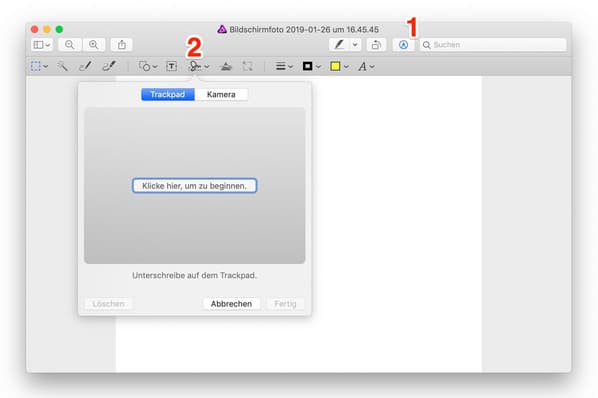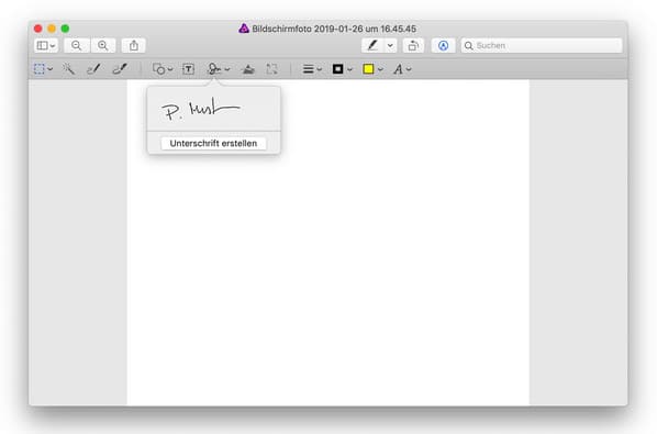Unterschreiben Sie mit einem nicht zu dünnen Stift auf einem weissen Blatt Papier. Für die Erfassung der Unterschrift öffnen Sie im Programm «Vorschau» eine beliebige Datei: ein Bild, ein PDF … was auch immer.