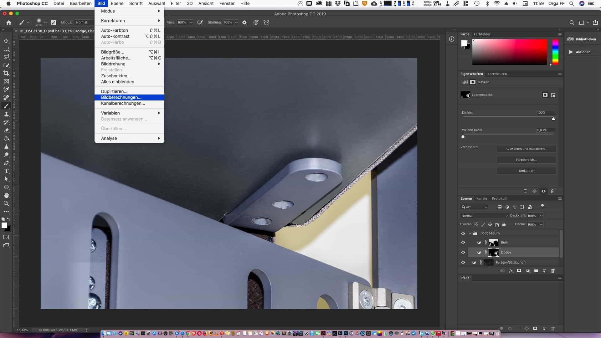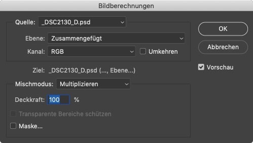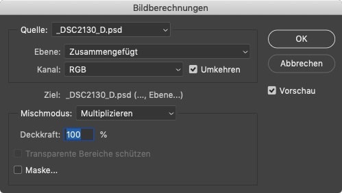 - Die Maske muss aktiv sein. Im Hauptmenü von Photoshop Bild > Bildberechnungen