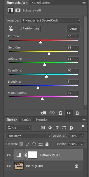 Schwarz-Weiß Einstellungsebene öffnen > Blendmode LUMINANZ