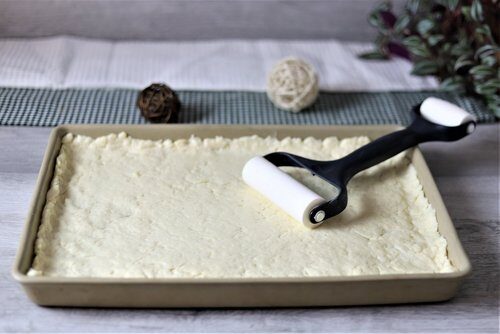 Den Teig nun direkt mit dem Teigroller auf dem gefetteten Ofenzauberer ausrollen.