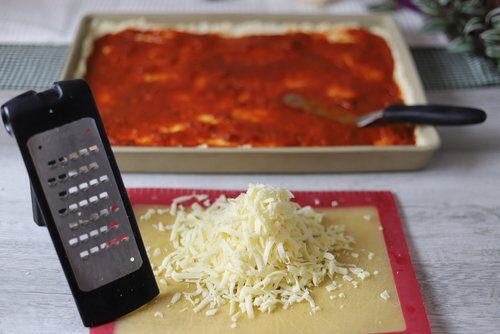 Käse mit der groben Reibe reiben und über die Soße verstreuen.