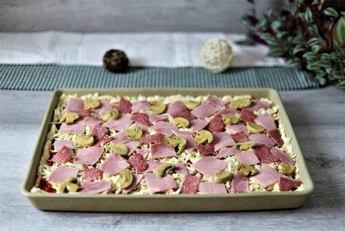 Je nach Geschmack nun Salami, gekochten Schinken, Champignons, Thunfisch, Zwiebeln etc. über den Käse verteilen.