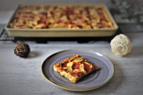 Den Teig nun direkt mit dem Teigroller auf dem gefetteten Ofenzauberer ausrollen.