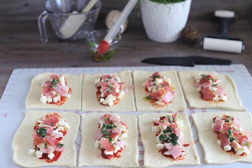 Mozzarella gut abgetropft in kleine Würfel schneiden, mit einem Küchentuch nochmal gut abtrocknen, auf dem Tomatenmark verteilen. Salami und gekochten Schinken würfeln, über die Mozzarellastückchen legen.