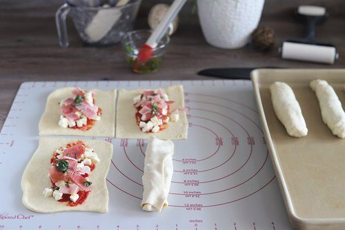Mit dem Teigroller auf der Teigunterlage rechteckig (ca. 52 x 32 cm) ausrollen. Mit dem Nylonmesser längs halbieren, dann quer vierteln, so dass 8 Stücke entstehen.