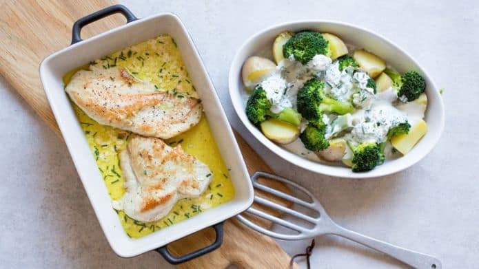 Die Kartoffel-Brokkoli-Mischung abgießen und in eine zweite Auflaufform füllen, mit der restlichen Soßenmischung aufgießen und ebenfalls im heißen Ofen noch einige Minuten weitergaren.