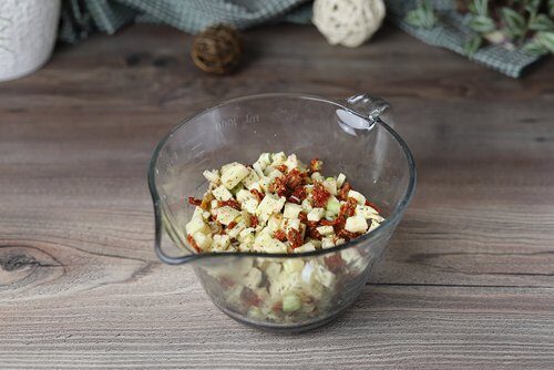 In der Zwischenzeit Lauchzwiebeln waschen und in Ringe schneiden, getrocknete Tomaten und Käse in Würfel schneiden, zusammen mit dem Ausgehöhlten der Kartoffeln sowie etwas Salz & Pfeffer in der großen Nixe vermischen.