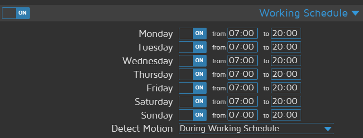 Ihr könnt den Zeitraum, in welchem Bilder und Videos bei Bewegungserkennung aufgenommen werden frei Konfigurieren. Ich habe für meinen Zwei Montag bis Sonntag jeweils zwischen 07:00 und 20:00 Uhr gewählt. Außerhalb des Zeitraums findet keine automatische Aufzeichnung statt!