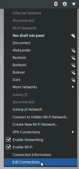 Other way is to access the network connections menu is by, clicking right click on the network icon, which is located on the taskbar, right besides the update notification icon. Right click on the icon and select the option – edit the network connections, and you’ll access the Network connections menu.