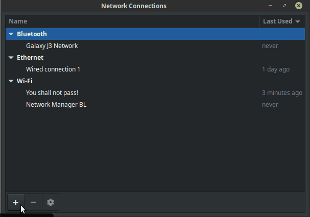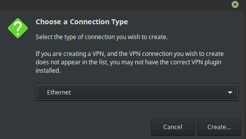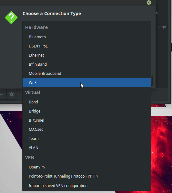 In the network connections menu, on bottom left, there’s a plus sign. Click on the plus sign in order to create a new connection. A prompt window will open, where it asks what kind of network connection we need to setup. In the selection drop box, we need to select WiFi and click on create button. Next, a window will open in which we need to enter our parameters.