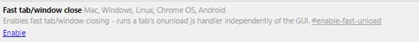 chrome://flags/#num-raster-threads - Enable fast tab/window close – This will run Chrome’s onunload JavaScript handler independently of the GUI to make tab closing faster.