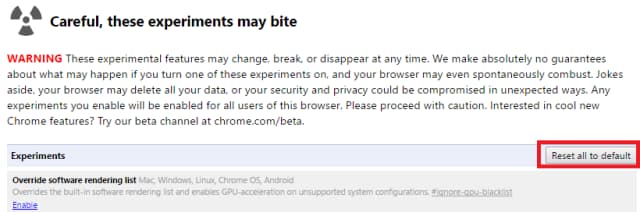 If you find that you’ve broken something but you’re not sure which setting caused the problem, you can easily restore all the flags to their default settings. Look for the Reset All To Default option in the top right-hand corner of the menu. Click it, and restart your browser.