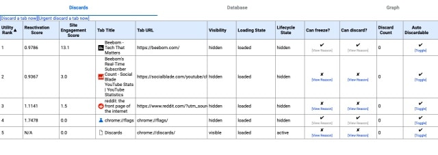 Chrome maintains a memory use list at Chrome://discards and will now start to discard tabs, starting from the bottom – highest precedence. This means it kills the process and disables the tabs in an attempt to conserve memory and you’ll have to reload them once you’re ready to use them again!