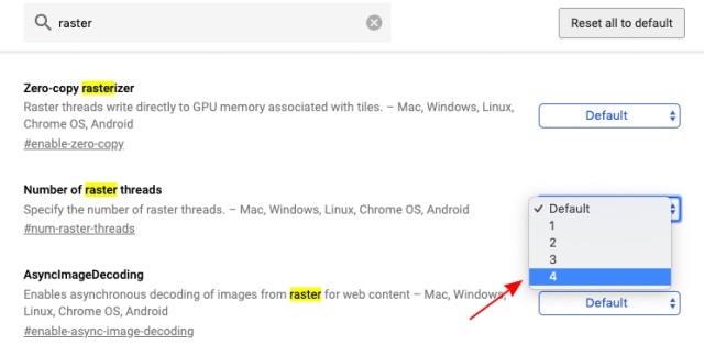 Here, you need to search for the ‘raster’ keyword and then change the ‘default’ value of the #num-raster-threads flag to 4 to speed up the time it takes to load images in Chrome. It’s expected to make your browsing experience a little smoother.
